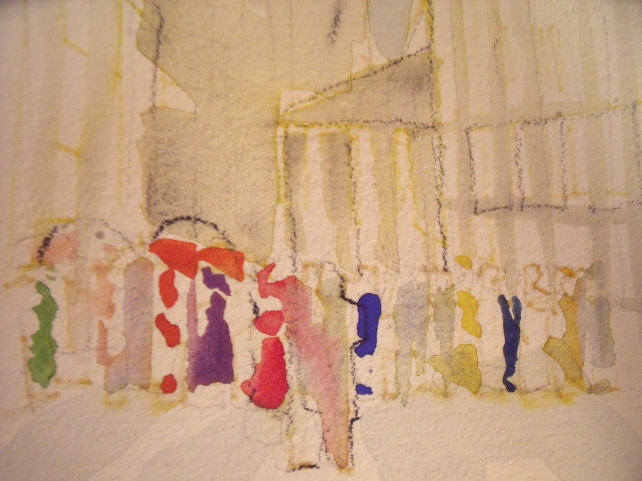 - RICHARD AHR 1929-2012 NEW YORK CITY "WAITING IN LINE IN OUR FINERY" WATERCOLOR